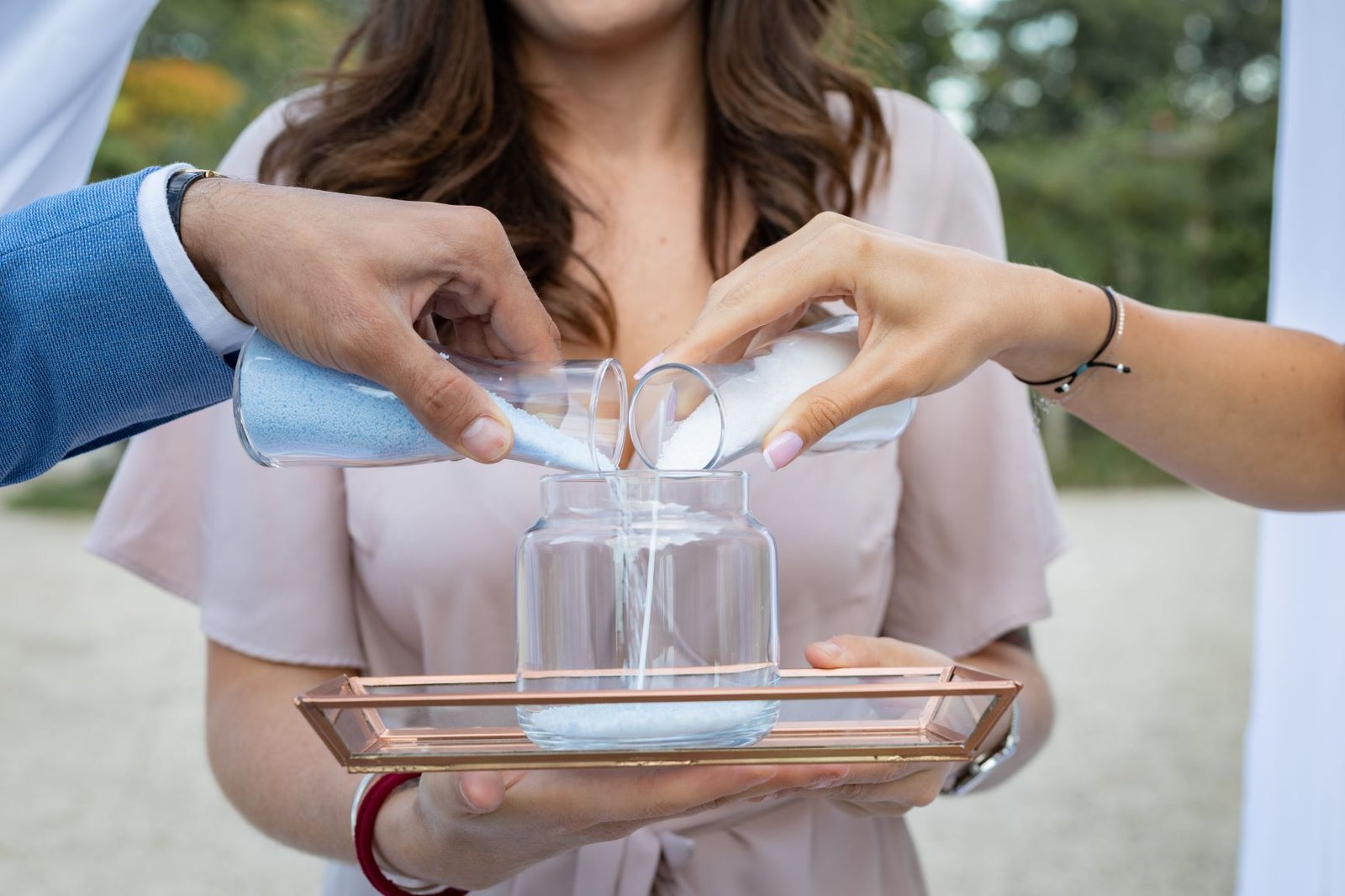 – Le rituel du sable : Prenez au minimum deux sables de couleurs différentes (plus si vous voulez faire participer vos proches) un pour chacun des époux. En même temps, vous verserez le sable dans un récipient transparent afin de mélanger vos deux personnalités, vos deux familles, vos deux êtres. Vous pouvez choisir de laisser les strates visibles ou bien de mélanger complètement les deux couleurs jusqu’à ne plus pouvoir les différencier. Symbole de votre union totale et entière. Personnellement, j’aime remplacer le sable par des billes de cire colorée en plaçant une mèche dans le récipient encore vide, vous pourrez ensuite allumer la bougie ainsi formée et faire briller la flamme de votre amour.